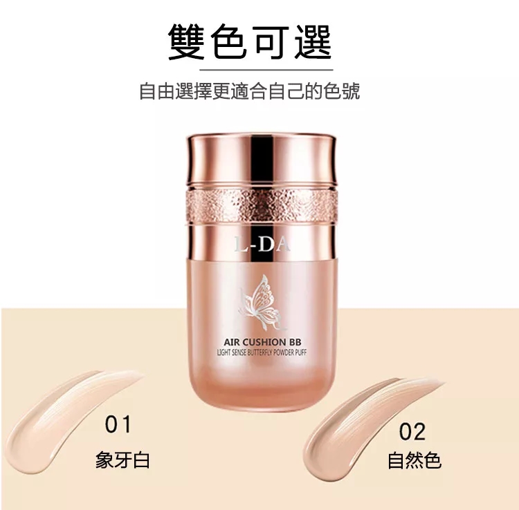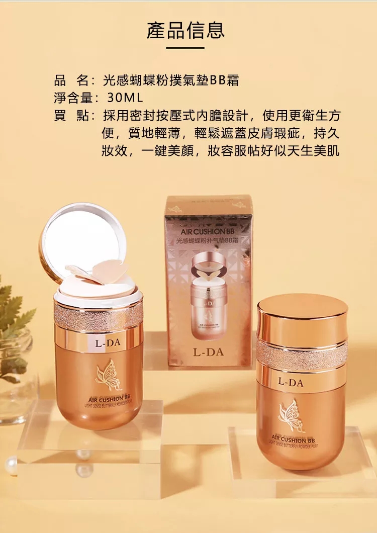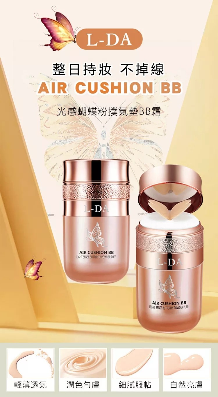 L-DA 光感蝴蝶粉撲氣墊bb霜遮瑕隔離一體式遮瑕粉底液,亮達美顏粉底霜/氣墊霜30ml,輕薄保濕遮瑕膏控油養膚不卡粉亮膚,隱形毛孔瑕疵,打造光澤奶油肌膚,清爽不黏膩,30秒打造無瑕透光肌。 #BB霜#光感蝴蝶粉撲氣墊bb霜#遮瑕#粉底#滋潤#保濕#提亮#不易脫妝#服帖輕薄#修飾#不浮粉#水潤#清爽#修顔#自然#持久#透氣#細緻毛孔